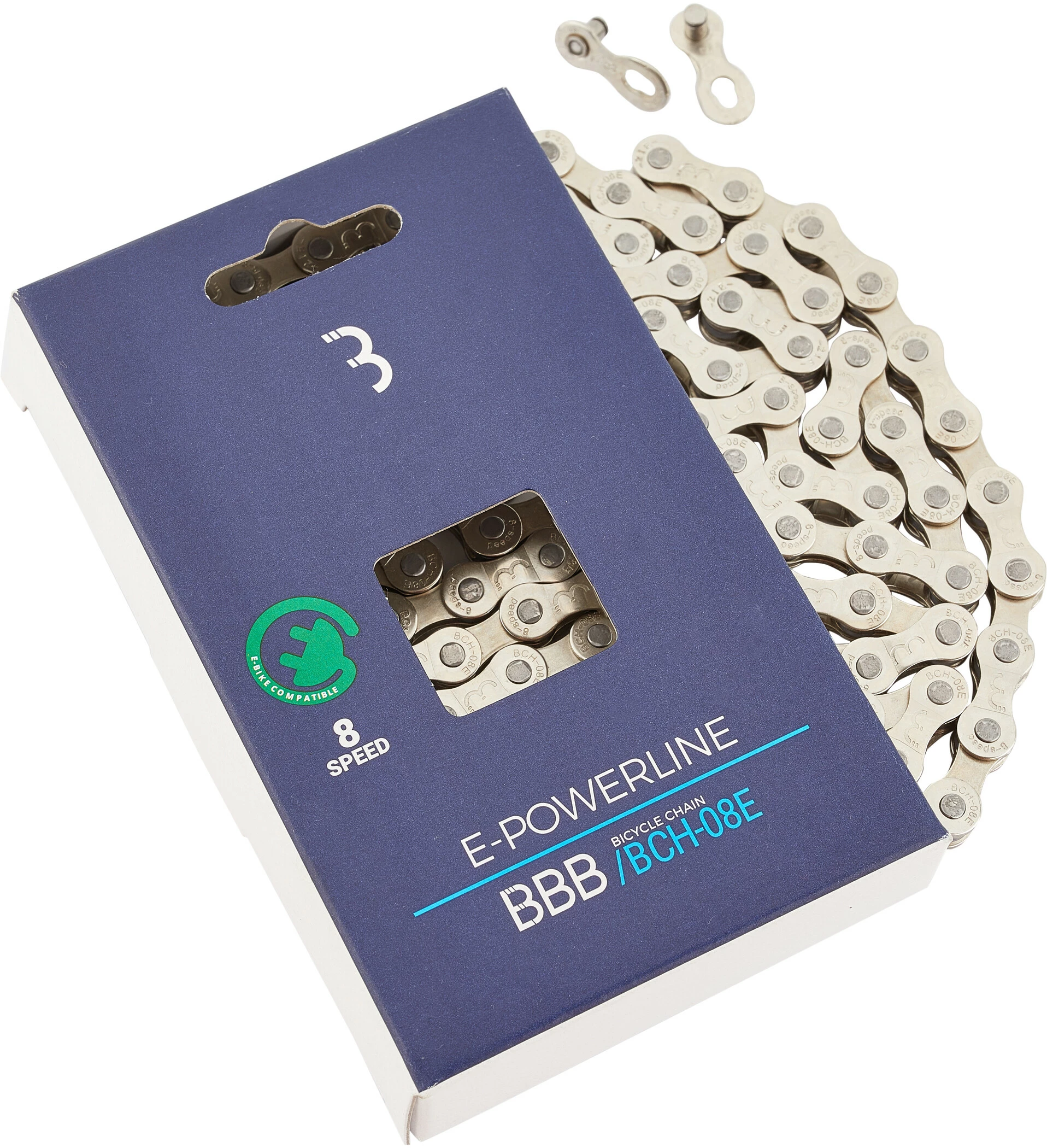 De BBB E-Powerline BCH-08E ketting is geschikt voor derailleurversnellingen en heeft versterkte kettingplaten speciaal voor gebruik op e-bikes.