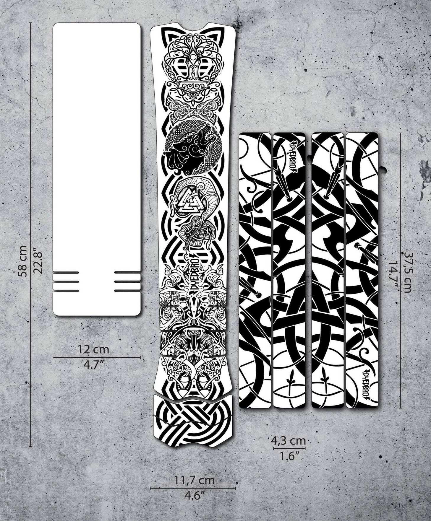 1x bovenbuisbeschermer, 2x extra folie voor grotere frames, 1x onderbuisbeschermer (transparant en zonder patroon), 2x kettingsteunbeschermer, 2x staande achtervorkbeschermer