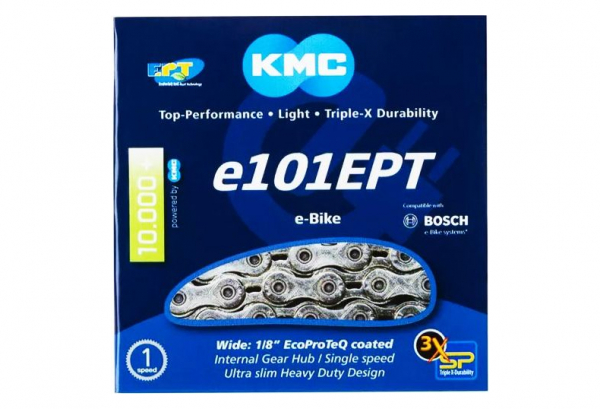 De KMC E101 EPT e-bike ketting is ideaal voor gebruik met geïntegreerde versnellingsnaven, inclusief high-end naven zoals Rohloff. In combinatie met een KMC kettingblad belooft deze ketting een zeer lange levensduur (meer dan 10.000 km volgens de fabrikant).