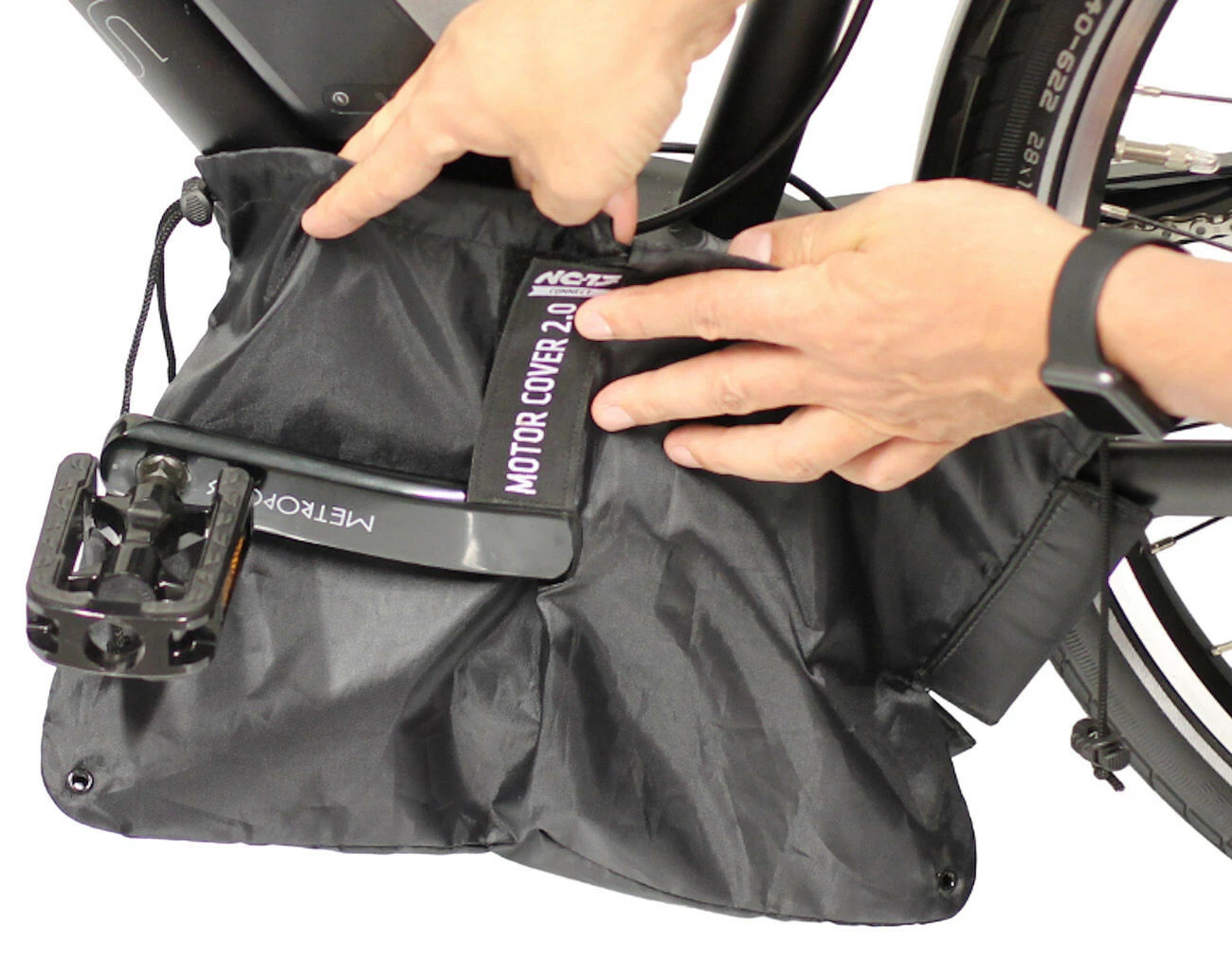 - De motorkap is bedoeld als transportbescherming en moet vóór het rijden met de e-bike worden verwijderd
