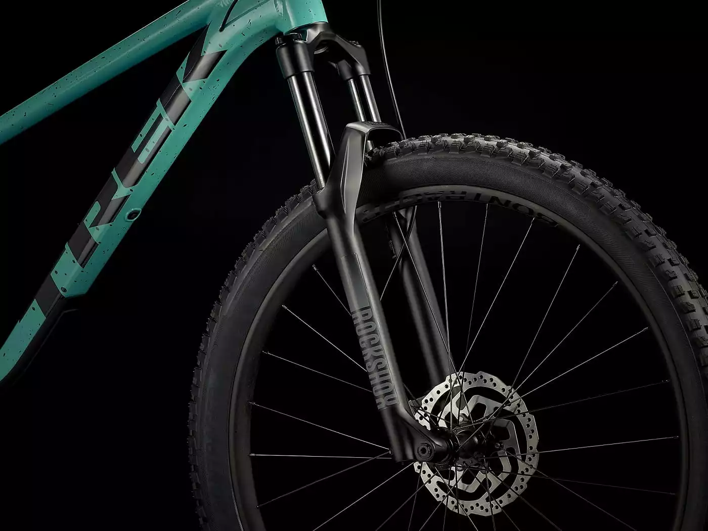 - De Solo Air veer van de RockShox verende voorvork is lichter dan een stalen veer en kan eenvoudig worden aangepast aan het gewicht van de rijder