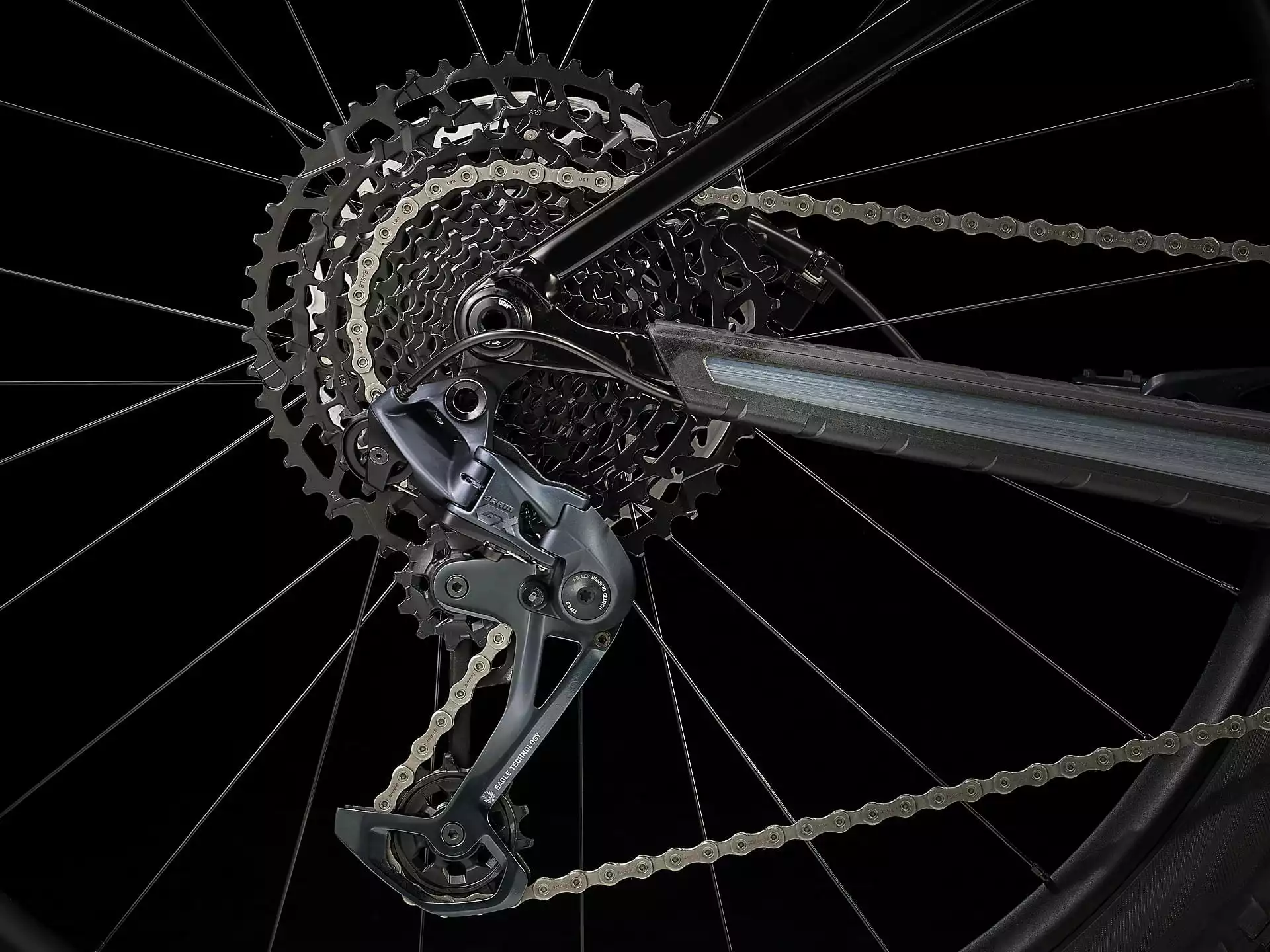 HR naaf: Bontrager, aluminium, afgedicht lager, 6-gaats schijfbevestiging, Rapid Drive 108, 10-speed Shimano freewheel naaf, Boost148, 12 mm steekas